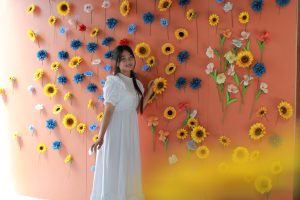 Khu hoa check-in được thiết kế với hàng trăm bông hoa hướng dương vàng rực, xen kẽ cùng hoa xanh, đỏ, hồng nổi bật trên nền tường cam ấm áp. Sự phối hợp khéo léo giữa màu sắc tươi sáng và bố cục nghệ thuật tạo nên một không gian sống ảo “không góc chết”, phù hợp cho mọi phong cách chụp – từ nhẹ nhàng vintage đến trẻ trung năng động.